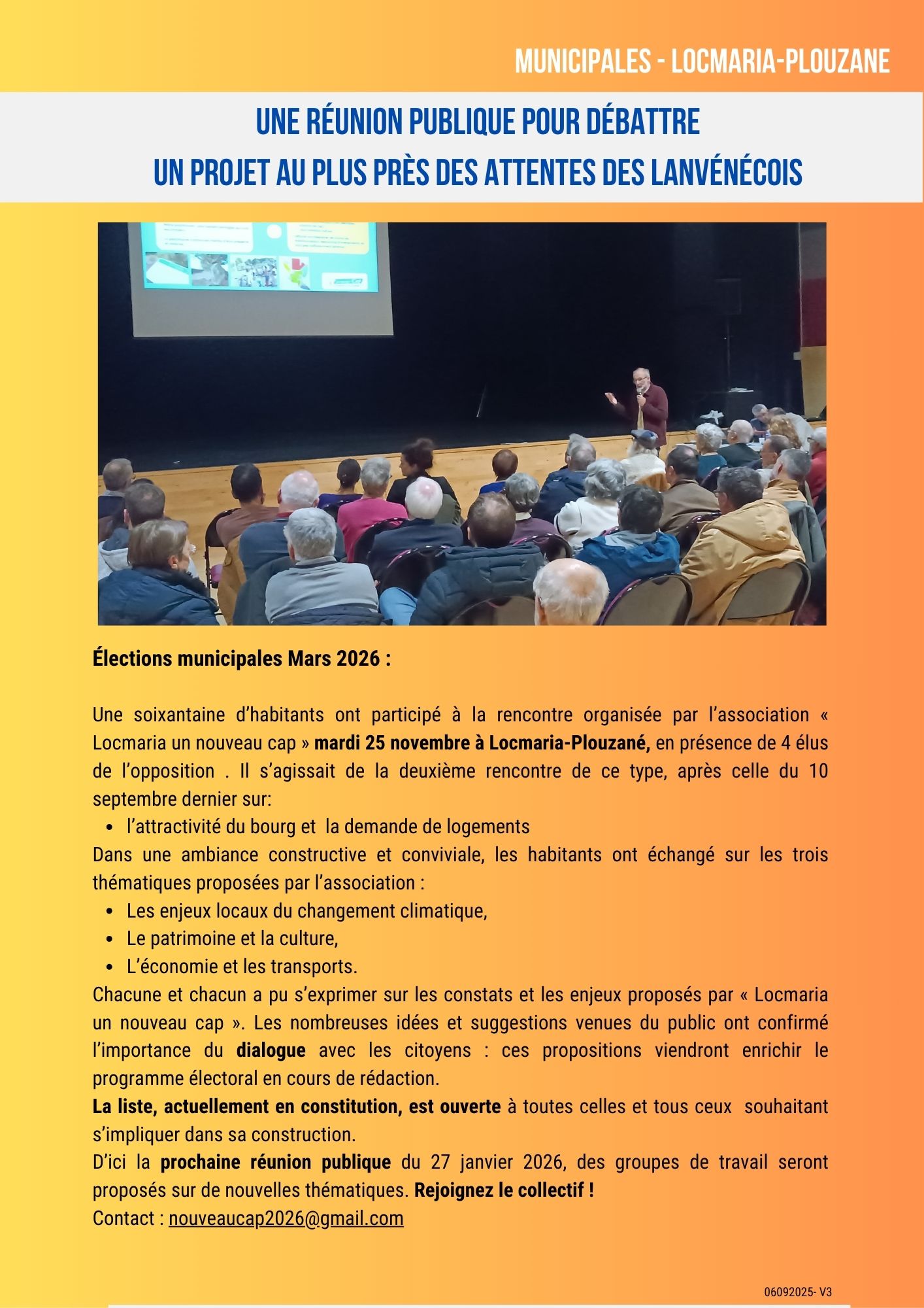 Retrouvez ici nos publications Campagne électorale Votez le 15 mars !Annonce de candidatureRéunion publique du 27/01/26Réunion publique du 25/11/25 La Presse en a parléConseil communautaire du 25 janvierOuest-France 15 févrierTélégramme 16 février Communiqués de presseSeptembre 2025 La Lettre de nos élusLa lettre de août 2025La lettre de juin 2024La lettre de janvier 2024La lettre de juin 2023 Expression des élus Locmaria Un Nouveau Cap dans la revue municipale « de l’Arvore à l’Argoat »février 2026Octobre 2025Octobre 2024Juin 2024Février 2024Octobre 2023